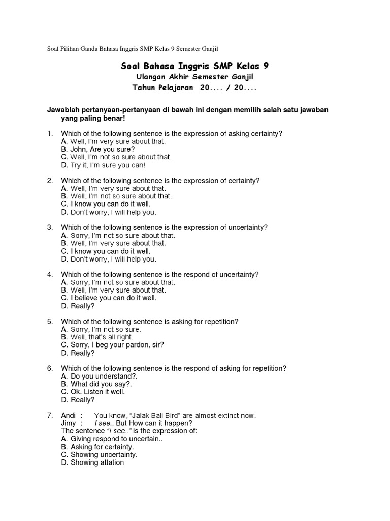 16+ Soal Uas Bahasa Inggris Kelas 9 Semester 1 Kurikulum 2013 Pictures. Soal dan kunci jawaban siap penilaian akhir semester 1 (uas i) mapel bahasa inggris smp/mts kelas 9 (sembilan/ix) kurikulum 2013 diharapkan dapat menjadi rujukan bagi peserta didik untuk mempersiapkan diri menghadapi penilaian akhir semester i khusus materi mapel bahasa inggris. Squad, tidak terasa ya semester ganjil untuk tahun ajaran 2018/2019 sebentar lagi sudah akan berakhir.