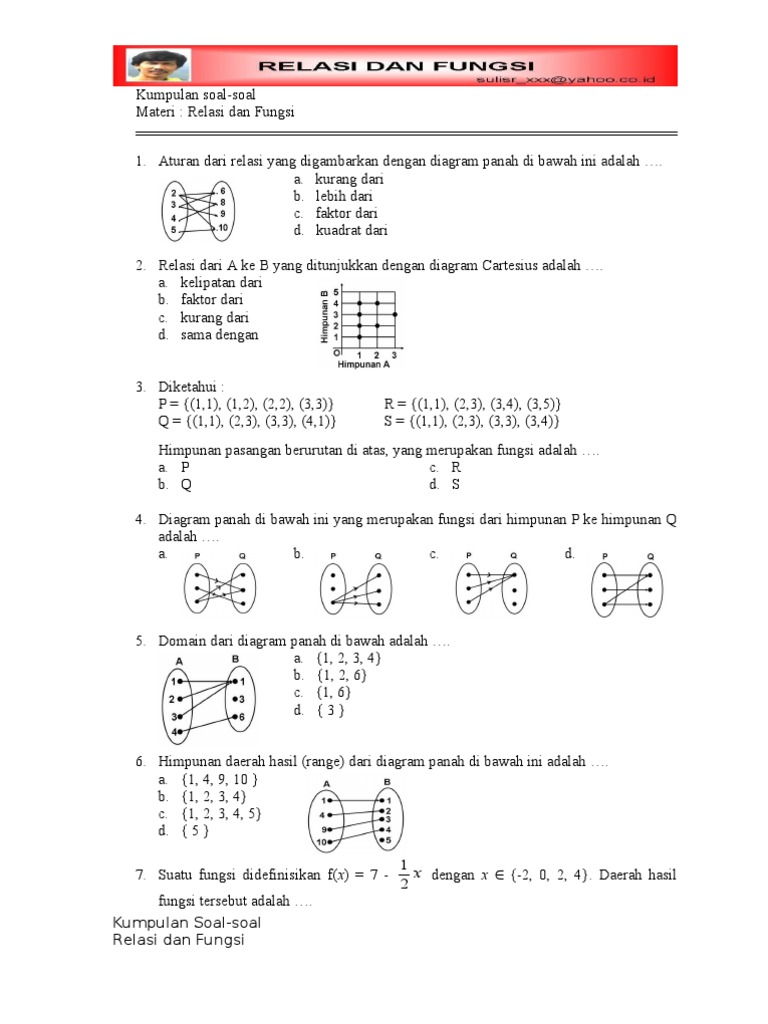 Suatu relasi dari himpunan a ke himpunan b merupakan pemasangan anggota himpunan a dengan anggota himpunan b. Materi matematika kelas 8 semester 1 meliputi pola bilangan, koordinat kartesius, relasi dan fungsi, persamaan garis lurus dan sistem persamaan linear dua variabel. Fungsi dari adanya koordinat kartesius adalah untuk menentukan suatuobjek tersebut berada pada posisi titik mana saja dimana menggunakan bilangankoordinat (x) diagram kartesius merupakan penentuan titik pada gambaran objek dalam sistem koordinat yang terdiri dari sumbu x dan y. Jika relasi himpunan a ke himpunan b adalah relasi kelipatan.