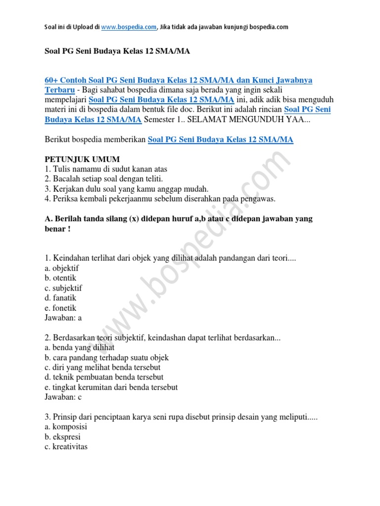 19+ Contoh Soal Dan Jawaban Seni Budaya 60 Photos. 60 contoh soal pg seni budaya kelas 12 smama dan kunci jawabnya terbaru adik adik kali ini kakak sudah menyediakan contoh soal pilihan ganda pada selamat datang kumpulan soal disini akan memberikan contoh soal latihan uas seni budaya kelas 12 kurikulum 2013 dan kunci jawaban 1. Untuk menggambar rambut yang benar, maka sebaiknya :