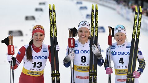 Linn svahn på väg mot segern i ruka med maja dahlqvist och jonna sundling vid sin sida.