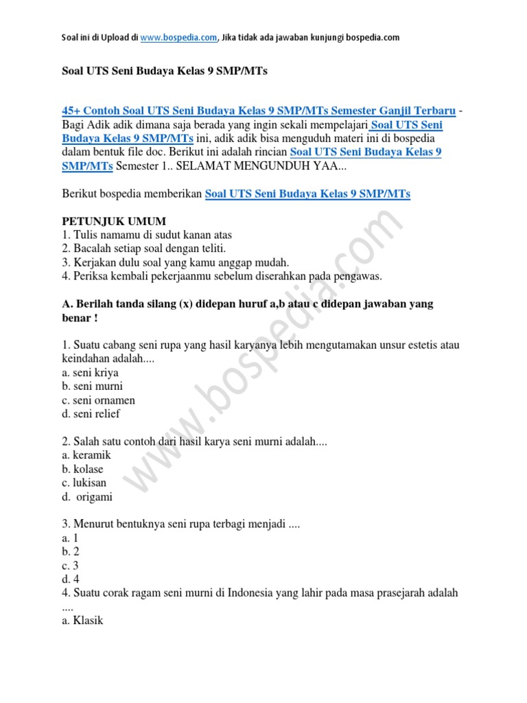 Soal Seni Budaya Kelas 8 Smp Mts 2020 Dan Kunci Jawabannya from majalahpendidikan.com