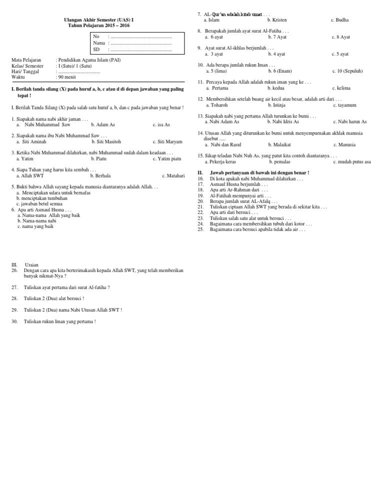 Background. Kali ini saya akan membagikan beberapa contoh soal pelajaran agama islam (pai) kelas 3 sd uas beserta jawaban. Berikut ini adalah beberapa contoh soal pendidilan agama islam (pai) beserta jawabannya, dimana soal yang kami bagikan ini terdiri atas 40 pg dan juga 5 uraian.