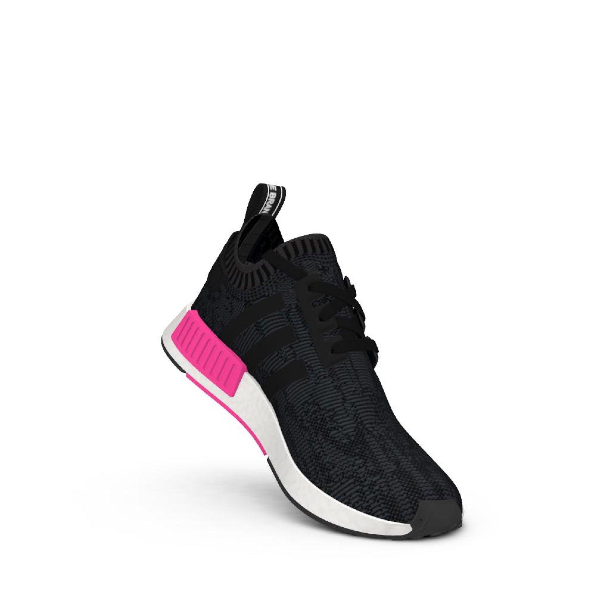 Background. Featuring black knit textile across the upper with what sticks out the most is shock pink on the collar as well as the heel and pull tab. Grab a pair of your favorite black and pink sneaker style for women, the nmd r1 from adidas.com today.