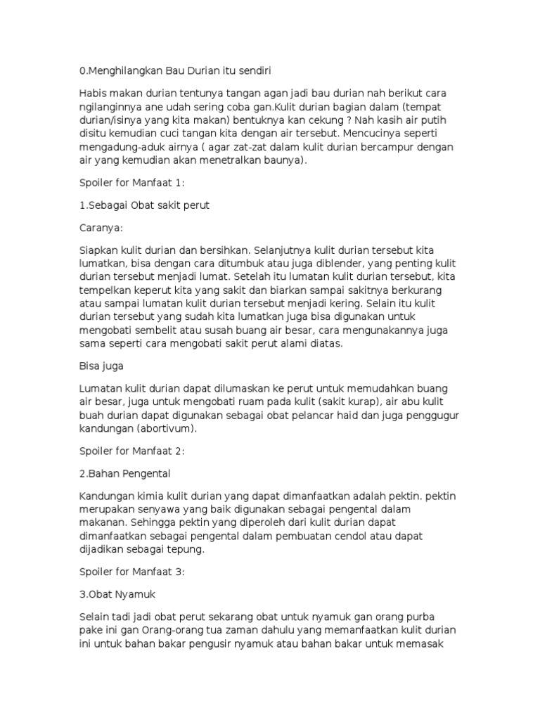 Gallery. Nah, manfaatkan serbuk durian tersebut sebagai salep yang ditaburkan ke bagian bisul secara teratur. Kamu bisa memanfaatkan kulit durian untuk mengusir nyamuk yang dapat menyebabkan penyakit, seperti demam berdarah.