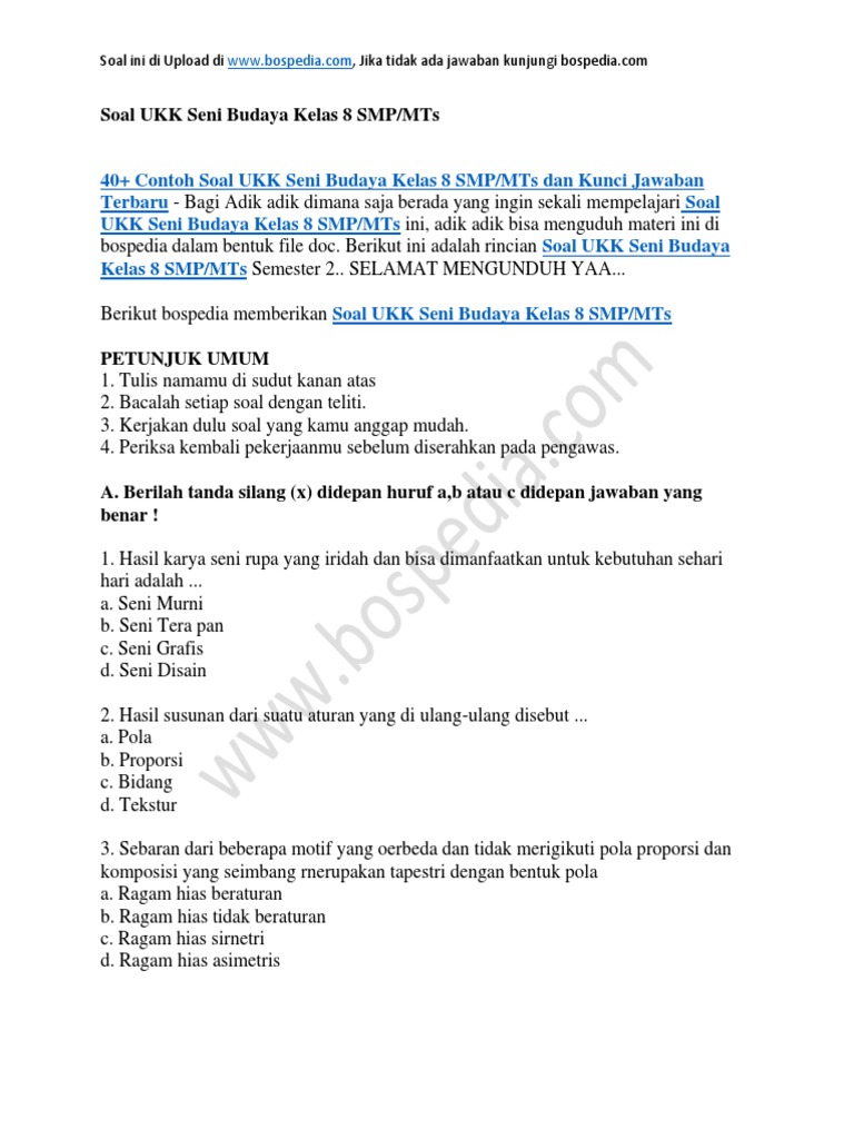 Pada kesempatan ini, kami berbagi contoh soal penilaian akhir semester (pas/pat) mata pelajaran seni budaya semester ganjil kelas 7 tahun soal ini terdiri dari 40 pilihan ganda (multi choice) dan 5 uraian/esai. 1) pengertian dari apresiasi seni rupa adalah. Tentu jika kamu bukan salah satu a.