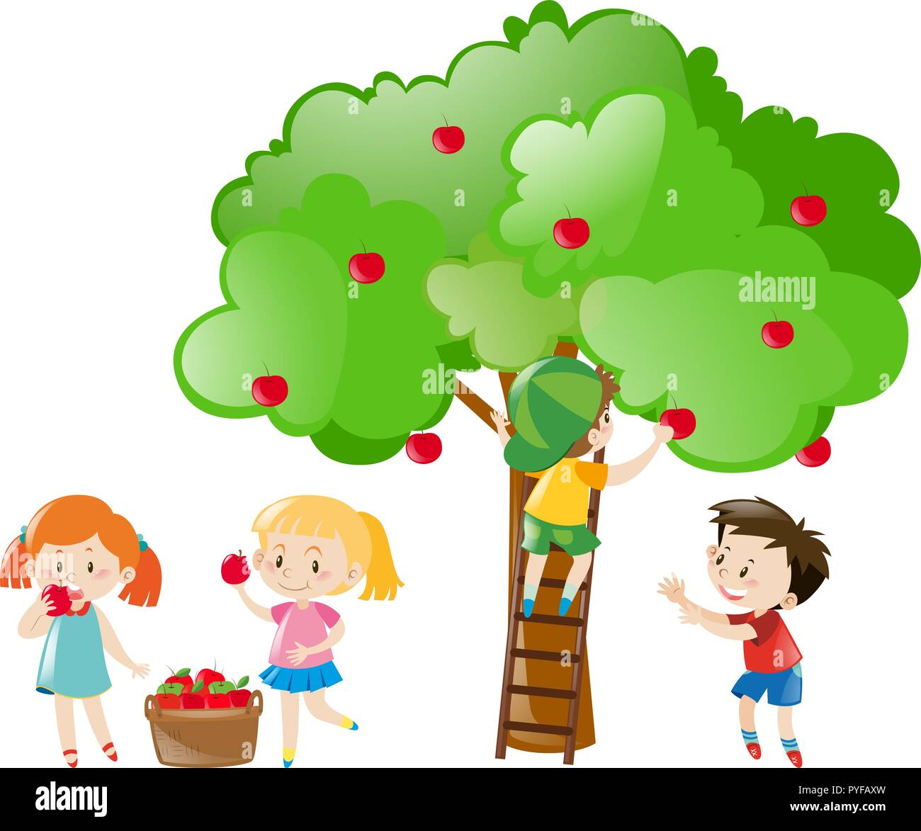 Background. Kids picking apples in fruit garden. Simple concept image of money tree.